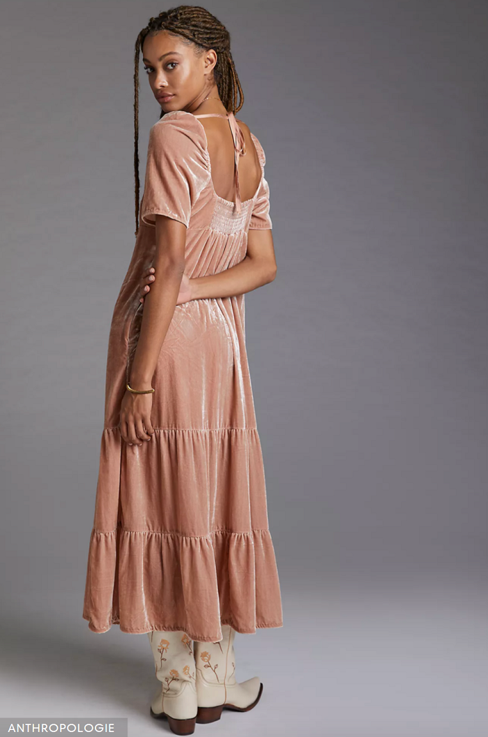 Giữa váy maxi xếp tầng hồng phấn nhung và lưng thấp buộc dây, thì đây là cách mặc lãng mạn nhất để theo xu hướng. Nó cũng có sẵn trong các kích cỡ lớn và nhỏ.
