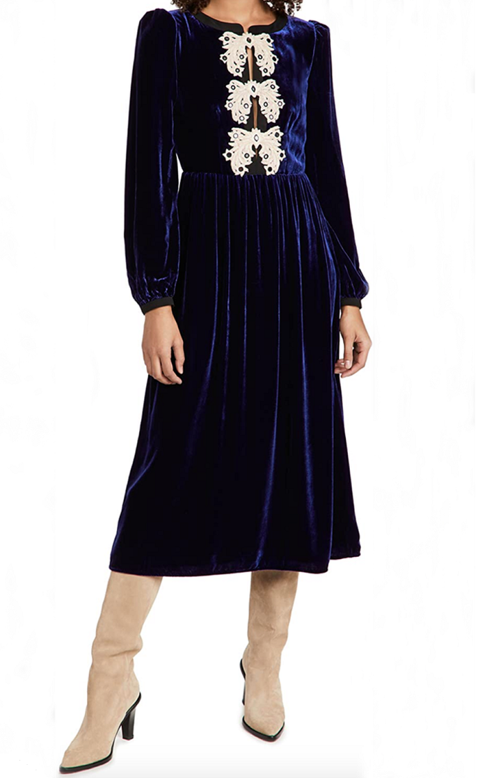Đây là một chiếc váy nhung dưới 150 đô la trông cực kỳ phong phú với giày cao gót nhọn và giày bốt.