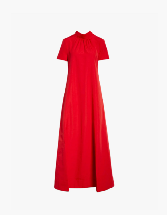 Nếu màu hồng chói lọi là màu được lựa chọn cho mùa xuân năm 2022, thì màu đỏ chính là màu được lựa chọn cho sàn diễn mùa xuân 2023. Váy maxi ống loe cổ cao của Staud mang tinh thần lễ và thời thượng.