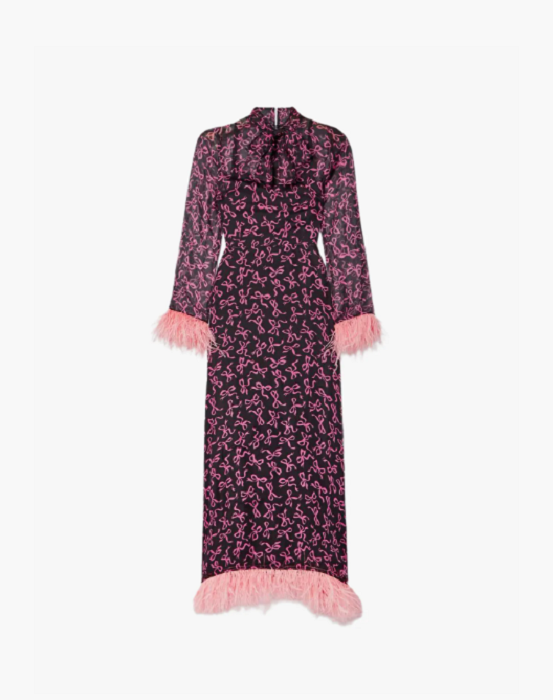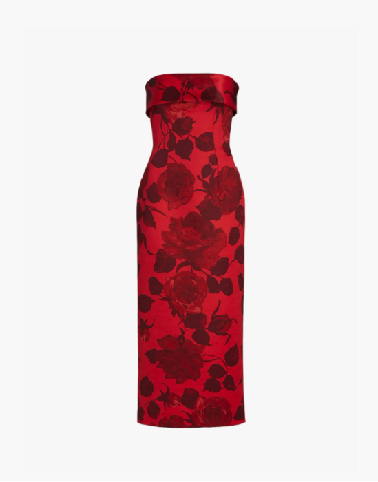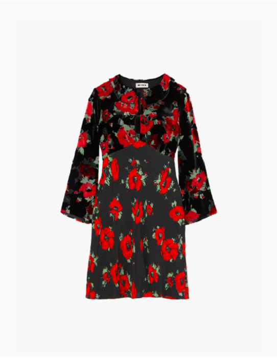 Chiếc váy hoa màu đỏ của Rixo giống như trang trí lễ hội và chiếc váy nhung với chất liệu crepe-de-chine là hoàn hảo cho đôi bốt cao đến đầu gối hoặc quá đầu gối.