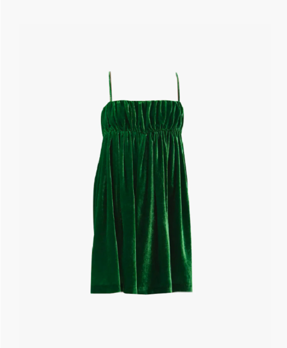 Giống như một dải ruy băng nhung sang trọng trên một món quà, chiếc váy mini màu xanh ngọc lục bảo được Bernadette thu thập là chiếc nơ trang trí hàng đầu cho mùa lễ hội.