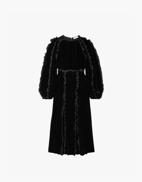Ulla Johnson mang đến cho chiếc váy nét tinh tế trên những đường diềm xếp nếp lãng mạn trong chiếc midi nhung đen đậm chất lễ hội nhưng cực kỳ dễ mặc.