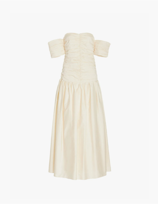Không phải tất cả các dịp và bữa tiệc đều sẽ là màu đen. Làm sáng vẻ ngoài khi đi chơi đêm của bạn với phong cách trễ vai xếp nếp này của Moré Noire, trớ trêu thay lại có màu trắng.