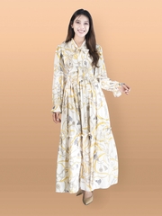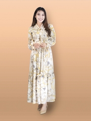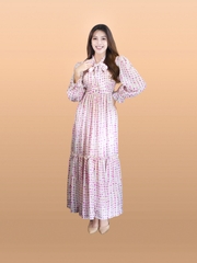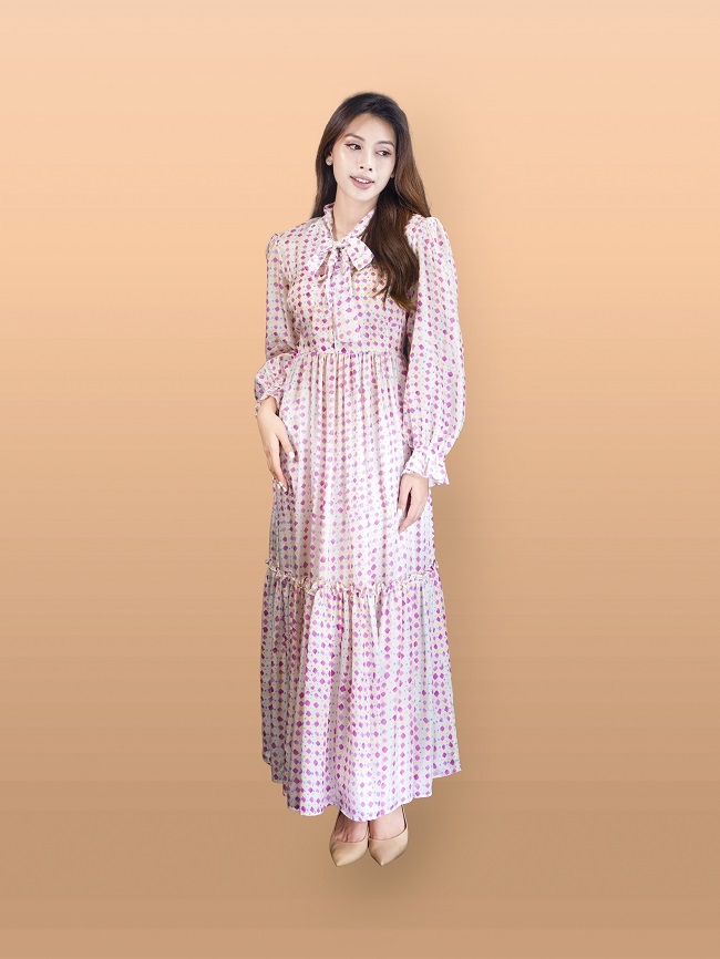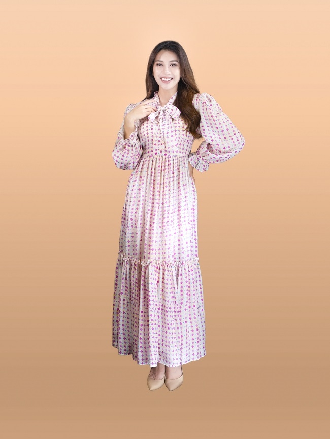 Váy cổ V dáng dài, thắt nơ cổ, tay bồng.